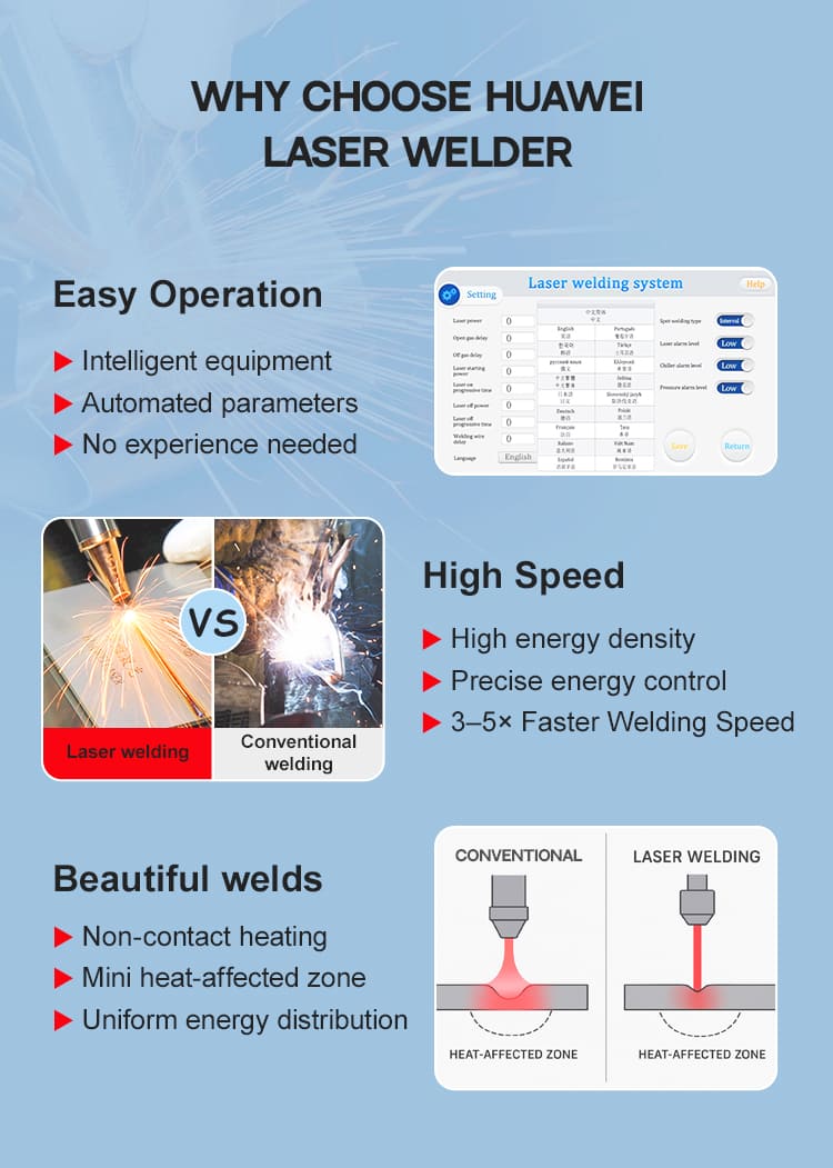 4. सञ्चालन गर्न र सिक्न सजिलो: ह्यान्डहेल्ड लेजर वेल्डिङ सञ्चालन सरल र सिक्न सजिलो छ, श्रम लागत बचत र द्रुत प्रशिक्षण र प्रेरणको लागि उपयुक्त छ।
